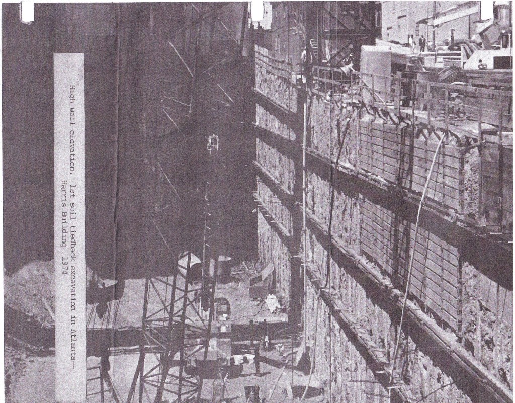 For five years, we operated an engineering practice in Atlanta, Georgia. Much of our work was generated by the construction of the MARTA rail system but also included buildings and highway bridges. One of our notable projects was excavation support for the 50-foot deep Harris Building basement. This work involved one of our most challenging installations: underpinning a nine-story brick wall on the very edge of the pit. DMB did this by drilling an angled shaft with the top beside the brick building footing and the bottom vertically under the footing. A beam was then inserted and blocked under the footing. The setup was carefully monitored on a daily basis to note any potential damage. There was none.